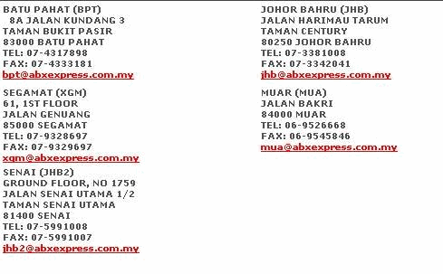 Abx Express Johor Branches Mycourier Malaysia Courier Service Directory